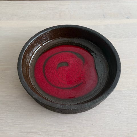 Så kan det snart ikke blive mere retro. En flot skål med rød glasur, dansk produceret I 70erne