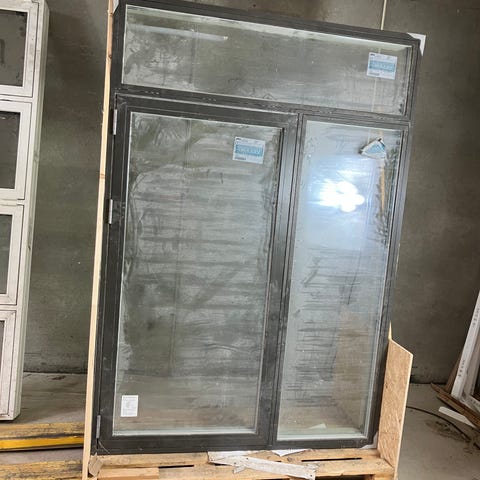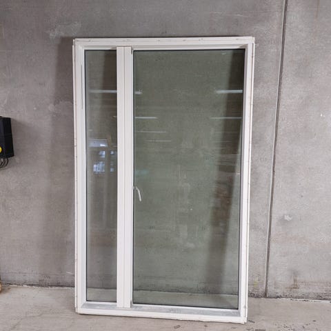Vinduesparti, træ/alu, VELFAC terrassedør/havedør/dør og vindue, mat nubret antracitgrå alu ude, hvidmalet træ inde, ventilation i karm.
