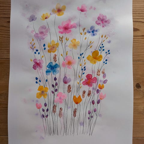Farverigt blomstermotiv på akvarelpapir i målet A3.