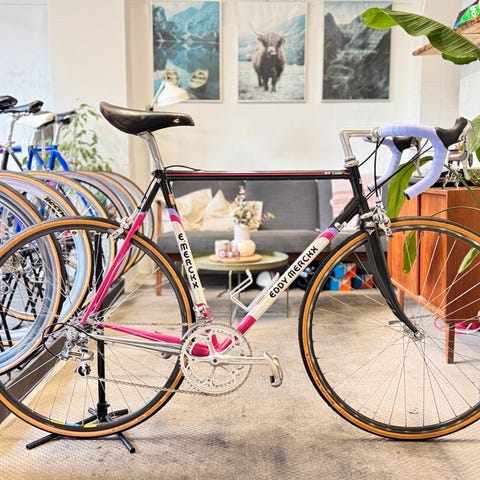 Flot Merckx-racer opbygget med blandede high-end Campagnolodele fx Chorus bremsegreb og bremser. Står på de legendariske Shamal-hjul med 8-speed-krans. Hjulene er stort set som nye - intet slid på bremseflader.