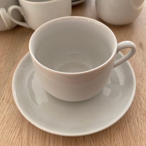 Kaffestel til 12 pers. Atelier "sort kant". 12 kopper m. underkop, 12 kagetallerkener, 1 flødekande, 1 sukkerskål. I alt 38 dele.