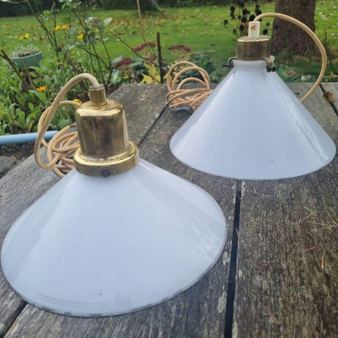 2 sorte/hvide opalglas pendler D 16,5 cm H 18 cm m hvide stofledninger, hele og uden skår.