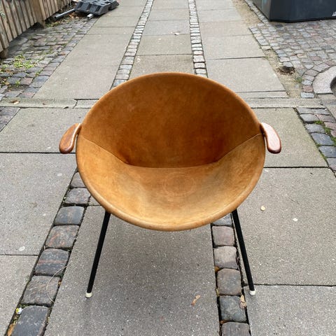 Smuk eksemplar af Hans Olsen’s ballonstol stolen har originalt sort stålstel monteret med cognac farvet ruskind og teak armlæn.