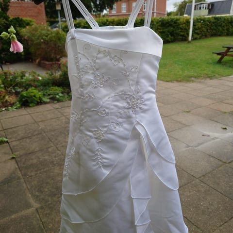 Fantastisk flot lang festkjole med blomster/ roser. Helt unik og enestående. Der står ikke str. I. Venligst se mål. Passer pige på 8 - 12 år. Længde ca. 115 cm fra skulderen ned. Brystmål ca. 77 cm.