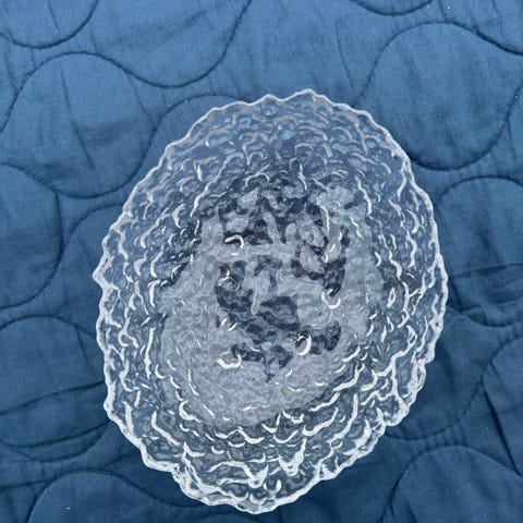 Vintage glasskål fra japanske Hoya i fantastisk smuk og brutalistisk stil. Den er fremstillet i krystalglas formet, så det ligner et isbjerg. Smuk japansk glaskunst✨️ Lækker og tung kvalitet. Vil være flot til servering af lækkerier eller tilbehør, men også fin som smykkeskål. Flot stand - som ny. Fremstillet i 1960/70-erne. Diameter: 16 cm.