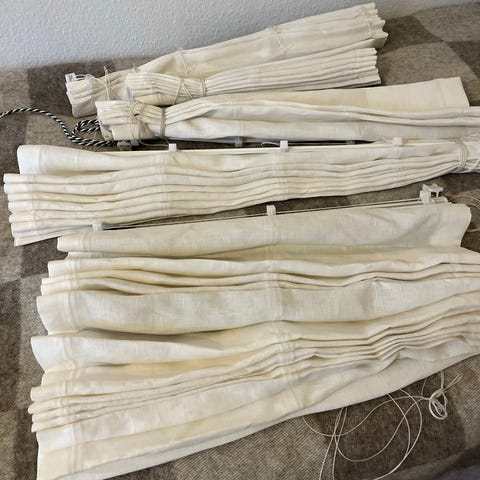 Smukke, hvide foldegardiner. HELT NYE, nåede aldrig at blive sat op inden flytning. Mål 90 cm. brede og 150 cm. lange. Kan anvendes på flere forskellige måder (se billeder), så de har bue i bunden, er lige, vipper ned i enderne, hæves og sænkes. De kortes ned med en helt almindelig saks. Prisen er pr. stk. ved køb af alle 4. Sælges også enkeltvis til 95,- pr. stk. Som nye med al tilbehør til at kunne lave de forskellige mønstre. Fra ikkerygerhjem uden husdyr. Kan sendes eller afhentes i Nørresundby. Yderligere rabat gives gerne ved køb af flere af mine annoncer.