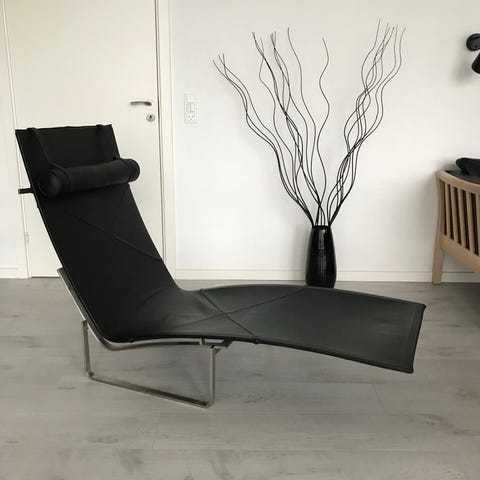Super flot Loungestol stel i stål, ryg i flettet flagline, sort læder hynde.