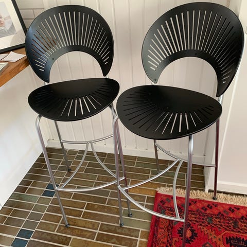 Klassisk, hvid barstol i smukt design. Denne hvide model er udgået. Lakering er løsnet omkring nitter og der er en lille revne i det ene sæde (se billeder).