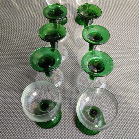 9 stk Rømer glas i forskellige farver. Ingen skår. Facetslebet stilk. Diameter 6,5 cm. Højde 19,5 cm. Sælges samlet
