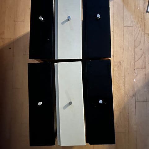 Montana skuffemoduler af blålakeret mdf. front med skuffer, bemalede sokler. H.77cm B. 35 cm. D. 38 cm. Fremstår med brugsslitage.