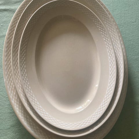 Ingen skår eller revner. Begge fade har et par små prikker i glassuren.