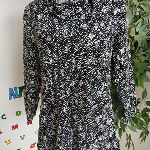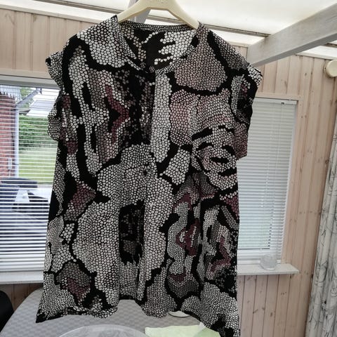 Den er god, men brugt og er gået lidt op i syningen under armene, se foto. Det kan sys, hvis man ønsker. Der er flere mindre steder, hvor blusen er gået lidt op i syningen, det kan sys i hånden eller på symaskine, hvis man ønsker. Sælges derfor billigt.