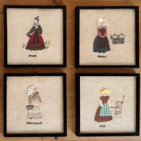 4 håndhæklede duge af bomuld. 1. 48 cm. Cremefarvet. 2. 36 cm. Beigefarvet. 3. 26 cm. Beigefarvet. 4. 27 cm. Lys grå. Ubrugte.