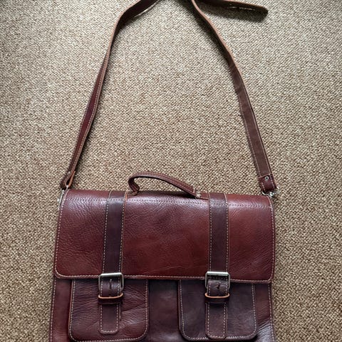 Tasken er købt i Rom men aldrig brugt. Kan anvendes både som skuldertaske og som rygsæk. Er lavet i flot stærk grøn læder. Højde 26 cm. bredde 31 cm.