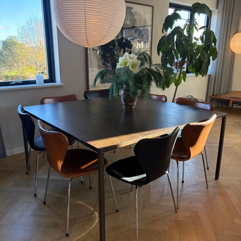 Spisebordet er udført med top i kompaktlaminat og stel i pulverlakeret stål. Så meget slidstærkt og kræver ingen vedligehold.