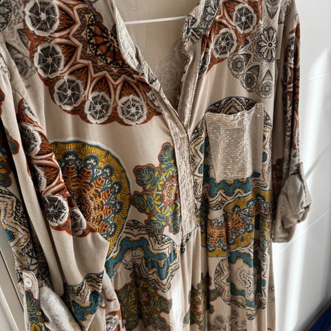 Smalriflet fløjlskjole i “sart” grøn. Der er trykknapper hele vejen ned og på ærmerne. Der er 2 lommer. Er vasket og prøvet, men aldrig brugt. Skal nok stryges