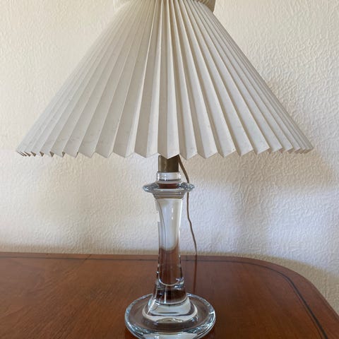 Produceret i det smukkeste grønne glas af Holmegaard i 1975. Sælges med LeKlint-lampeskærm.