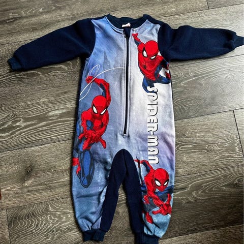 2 x ens fleece heldragter med Spiderman, str. 110-116. OBS på fnuller. Prisen er pr. stk. 1 heldragt tilbage.