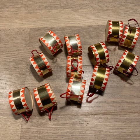 Julepynt. Trompeter m pynt til ophængning, Trompeter m pynt til ophængning. Måler 13 cm I hj. Meget dekorative. Til dukker og bamser eller dekorstion