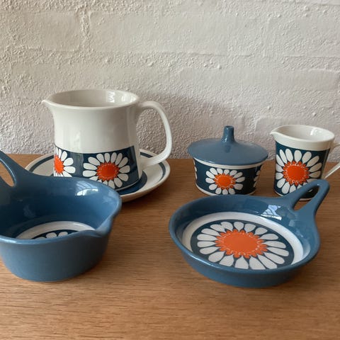2 fade, sovsekande, kartoffelskål, 2 flade tallerkner, 1 dyb tallerken, og 1 lille tallerken.