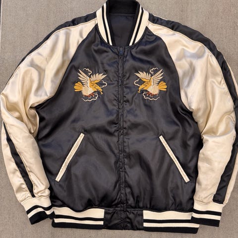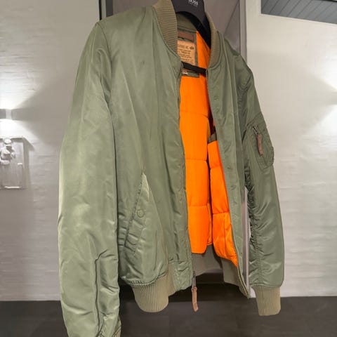 Fed skindjakke med Top Gun mærker og andre fede mærker.
