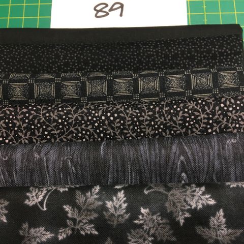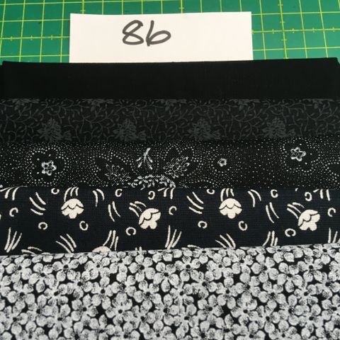 5 stykker stof / patchwork stof sorte og sortmønstrede stoffer.