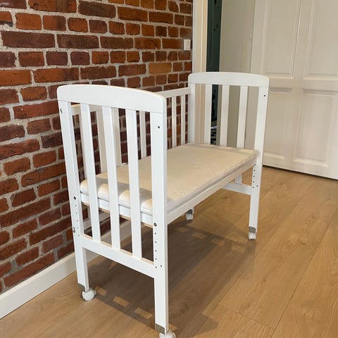 Bedside crib babyseng i grå og hvid. Sengen er beregnet til at stå ved siden af forældrenes seng, så barnet ligger tæt på. Den har justerbar højde med flere niveauer og åben side mod forældresengen. Siderne har netpaneler, som giver ventilation og mulighed for at se barnet. Egnet til spædbørn i den første periode, hvor der ønskes tæt kontakt om natten.