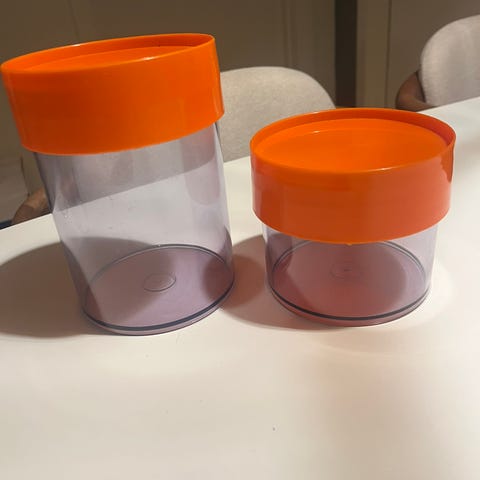 Tre små opbevaring bøtter i Pyrez glas med orange låg. De kan ligne Erik Kolds dåser. De er mærket i bunden IND.BRAS. De er i al fald ren retro. De ene glas er anderledes end de to andre, men det fungere OK. De er ikke så store, som det ser ud til på billedet, 9-10 cm høje og 6CM i diameter. Anvendelig til mange til. Prisen er for alle tre. NU NEDSAT FRA 125