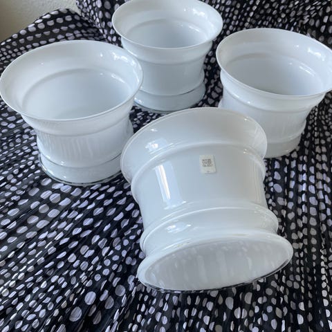 Jeg sælger mine store flotte Michael Bang urtepotteskjulere i opalhvid glas fra Holmegaard.