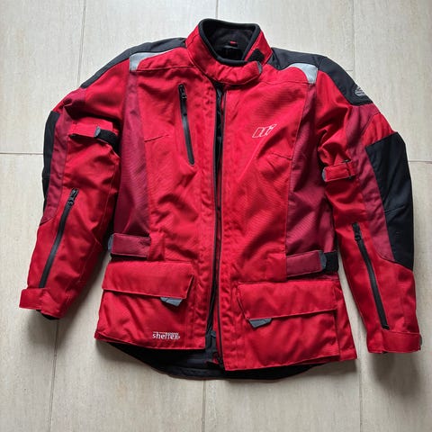 Jakken er helt ny og der medfølger regnjakke samt tilkøbt rygbeskytter.