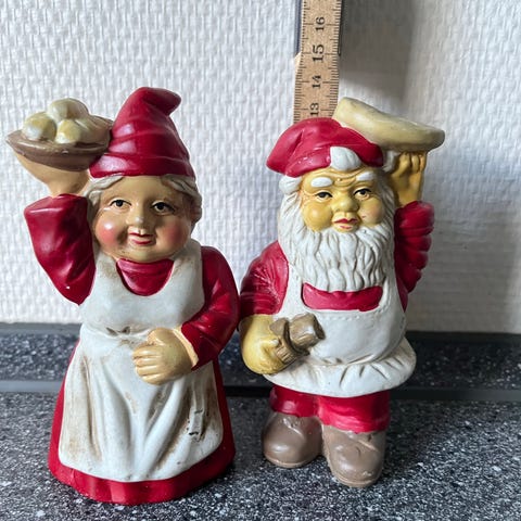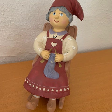 Nissepar i gyngestol. Nissemors mede på gyngestolen er desværre limet, men kan stadig rokke. Måske en kan lime eller reparerer det bedre