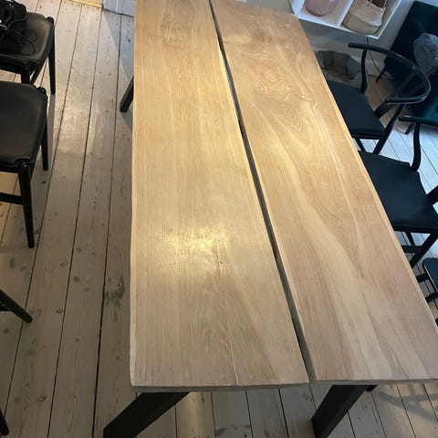 Lækkert, tungt og robust bord. Bordpladen er lavet at små stykker drivtømmer som er sat sammen.