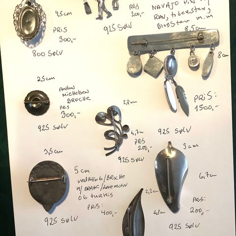 Hver broche koster 100-200 kr. pr styk alt efter størrelse. Brochen yderst til højre nederst er SOLGT.