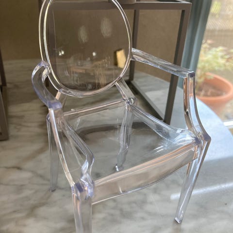 Vi sælger vores elegante Louis Ghost stol med armlæn i farven ‘Krystal’ (transparent), som er designet af Phillipe Starck for italienske Kartell. Stolen har brugsspor (se billeder) og prisen er sat derefter.