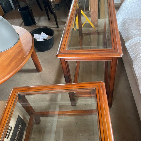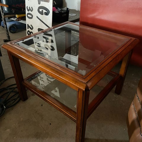 Bordet har glasplade og en aflang skuffe med rum i . Skuffens bund er af flet. Derved er der så mange muligheder… kom muslingeskaller, blade eller fotos af familie og venner i.