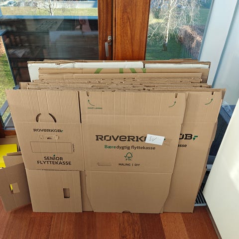 Senior prof. flyttekasser, har været brugt 1 gang sælges i 10 stk bunder for 150 kr, Mål: 672 x 380 x 373 mm i 7 mm pap.
