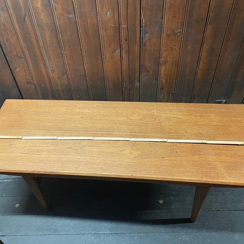 Sofabord i teaktræ med hylde under bordplade til blade og andet.