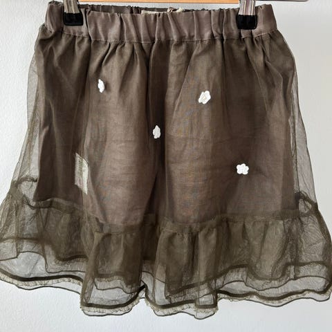 Kjolen har 2 indvendige lommer i hver side, og flæsekant forneden og flot kalvekrøs ned foran.