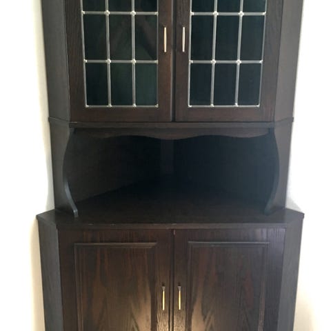 Gammelt ovalt barskab med låg og plade som kan tages af og bruges som bakke. Lavet i mørkt hårdt træ med små glasruder hele vejen rundt, forreste midterste rude revnet. Brugt, med skavanker/ridser som vist på billederne. Fra ikke ryger hjem. Kan hentes i Rødvig eller leveres gratis til Køge, Faxe, Rønnede eller Næstved.