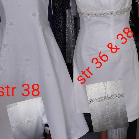 hvid, overdel + ærmer i blondestof, rund hals, lange blondeærmer, lynlås i ryggen, hvidt langt satinbånd i livet, så der kan laves en sløjfe eller bare hænge. fastsyet underkjole med v udskæring, tynde satinstropper, 95 % Polyester 5 % Spandex. MEGET SMUK, KLAR TIL BRUG, HELT INTAKT, Sender gerne, porto oveni