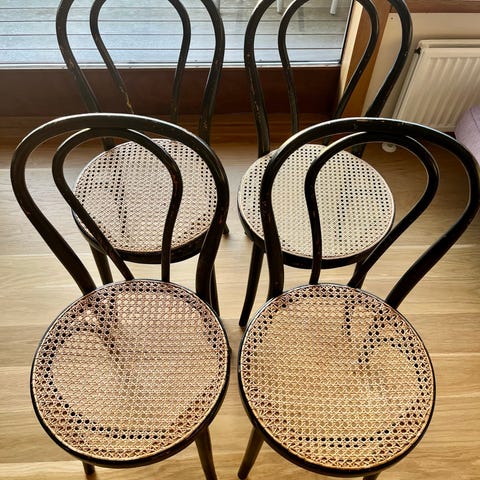 Fire flotte stole med fletsæder. To af dem har lidt kraftige fletsæder. Stolene er nymalede med en græskblå farve. Højde 85 cm, bredde på sæderne er 42 cm.