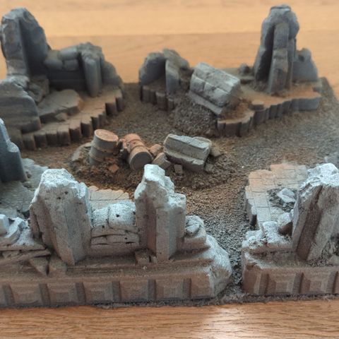 Sælger et flot malet terrænsæt til Warhammer, Bolt Action, D&D eller andre tabletop-spil. Sættet består af 28 dele, alle lavet af skum og malet i høj kvalitet. Perfekt til at skabe en ruineret by til dine spil. Terrænet giver et stemningsfuldt og detaljeret spilområde og passer perfekt til forskellige systemer.
