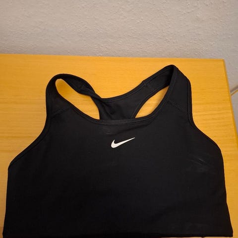 Lækker sports-BH fra NIKE, str. s/m-svarer til ca. str. 38. Elastisk. Sort Med kryds-stropper, så de ikke falder ned - dvs. stropperne sidder fast på modsatte skulder. Næsten ikke brugt og stand derfor som ny. Fra ikke ryger hjem.