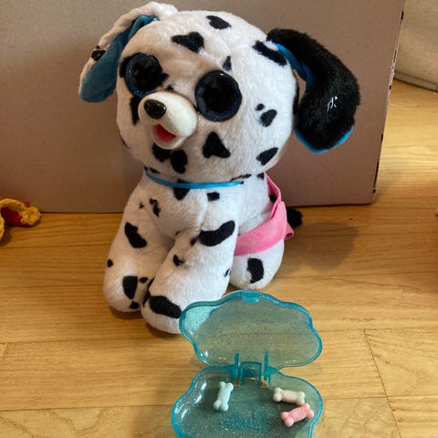 Sød lille hund. Mener den har kunne bjæffe og gå men den del virker ikke mere og låget der skulle være hen over batterierne mangler. Derfor prisen.