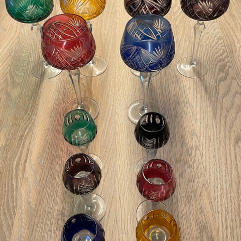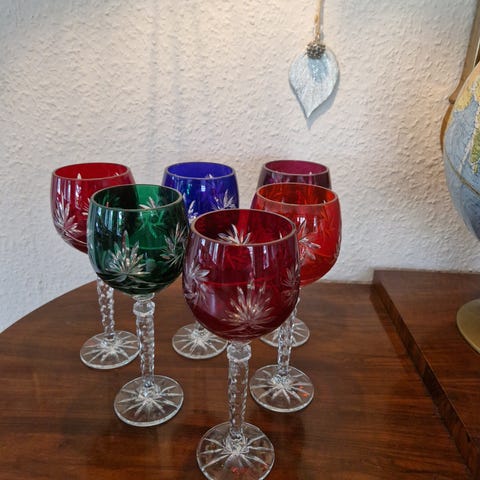 Fire bøhmiske vinglas - alle grønne med glasklar stilk og fod. Glassene er i fin stand uden skår.