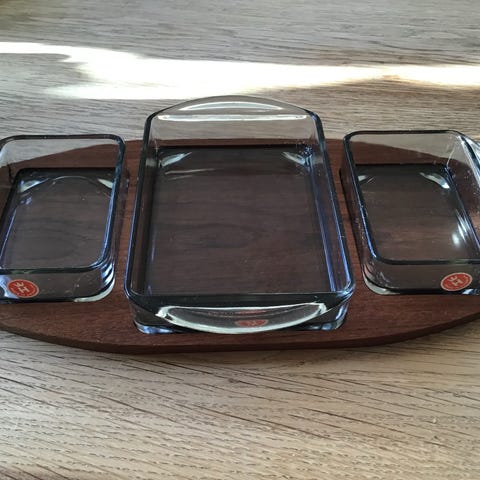 Teakbakke med 2 store og 2 små glasskåle i røgfarvet glas.