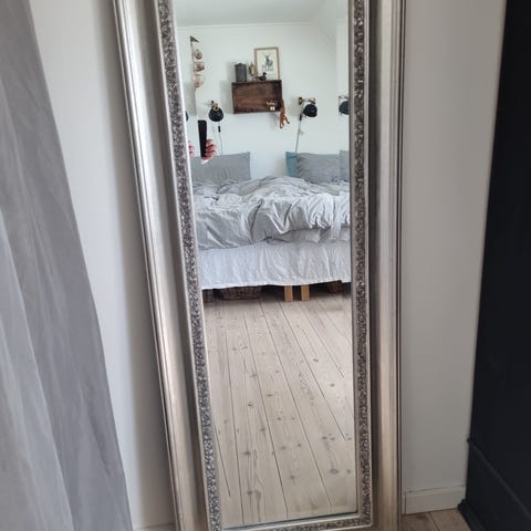 Sølvfarvet spejl. Måler 45 x 35 cm