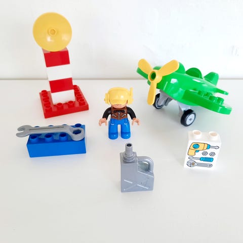 Lego Duplo, 10849. Mit første fly (som kan laves om til helikopter eller båd). Den ene blå brik (flad 2×4) er væk, men erstattet med tilsvarende grå. Hvis en anden farve ønskes, kan den erstattes med en gul eller sort brik (se sidste tre billeder). Anbefalet alder: 1,5-3 år.