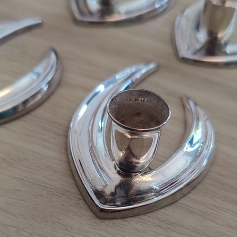 Små lysestager, Små sølv/sølvplet lysestage til pinde lys måske mærket ch. De er 4,3 cm høje og 6,5 x 3,5 cm.