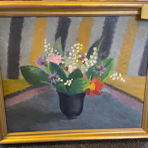 Motiv blomster med udsigt til Faaborg fjord mål 48x59